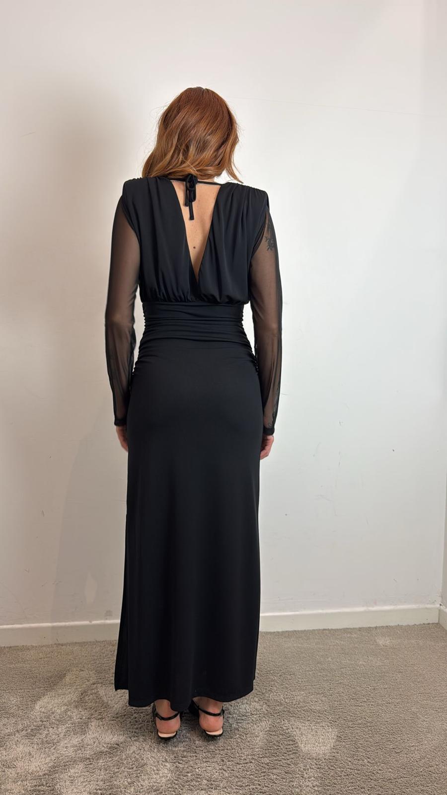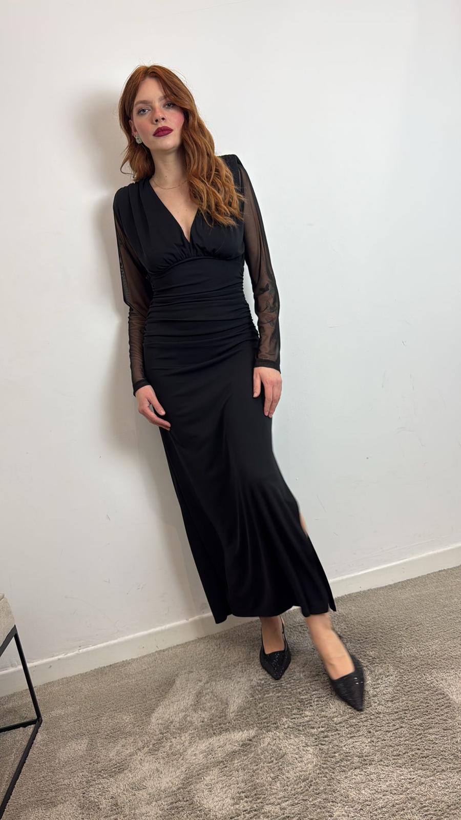 Abito Lungo Scollo A V Maniche Lunghe In Pizzo - Haveone cod. AMI_P055  color:nero