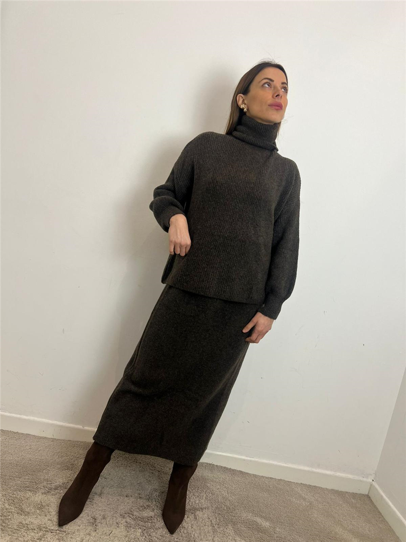 Completo Maglia e Longuette in Maglia HAVEONE, un elegante outfit in maglia di colore crema. Composto da un turtleneck oversize e una gonna lunga fino alla caviglia, è perfetto per un look minimalista e caldo durante l'inverno. Completa il tuo stile con stivali marroni scuri per un contrasto raffinato.