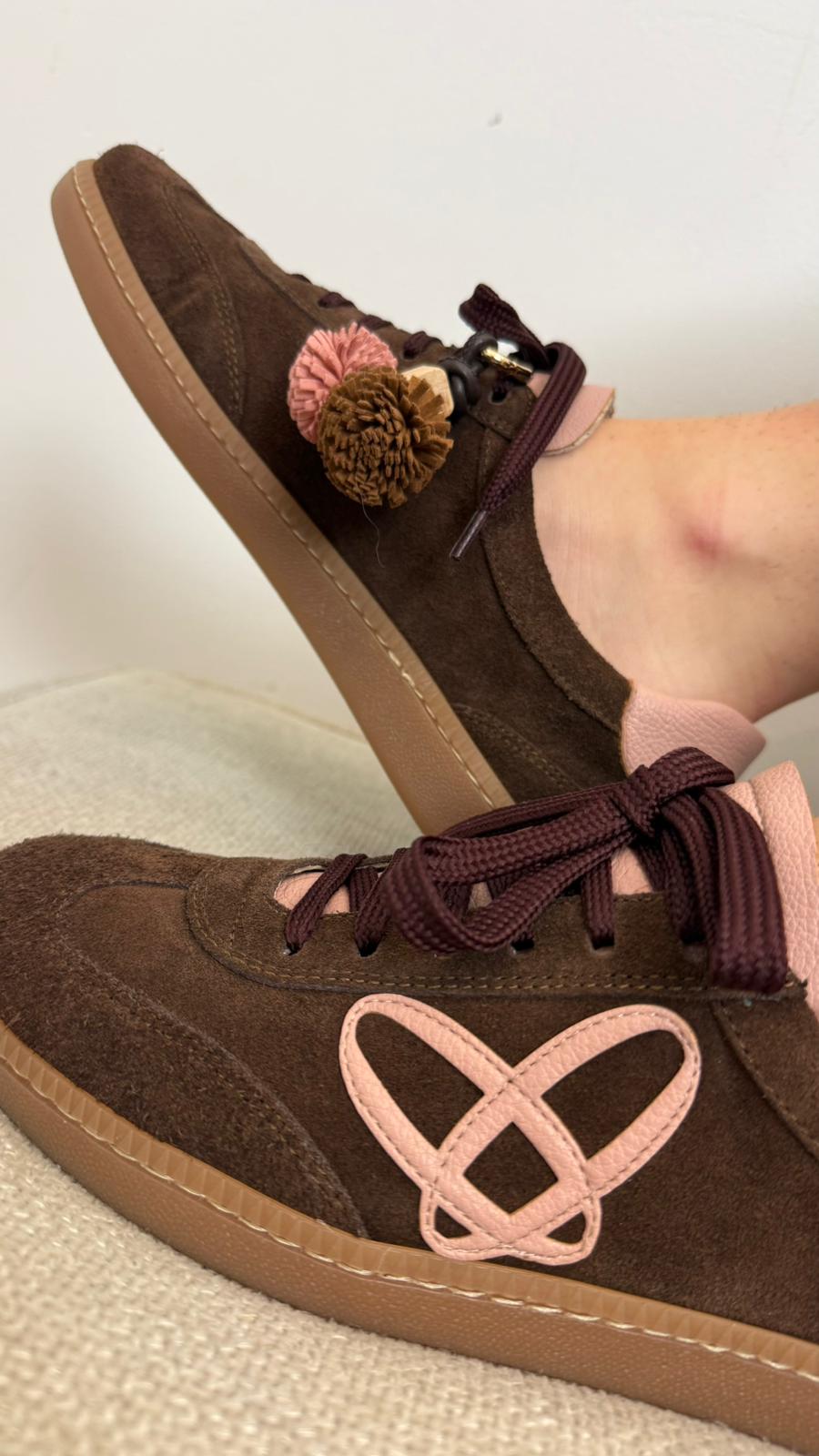 Le sneakers donna Ovyè in camoscio marrone uniscono comfort e stile in un modello casual chic perfetto per l’uso quotidiano. Il design sportivo è valorizzato da dettagli rosa a contrasto e da un pon pon decorativo che dona carattere e originalità.