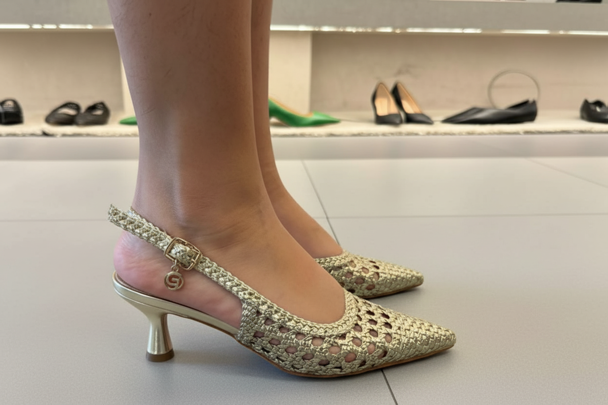 Slingback in intreccio laminato firmata Gold&Gold — il tocco luminoso che trasforma ogni look per la Primavera/Estate 2026.