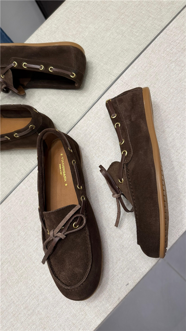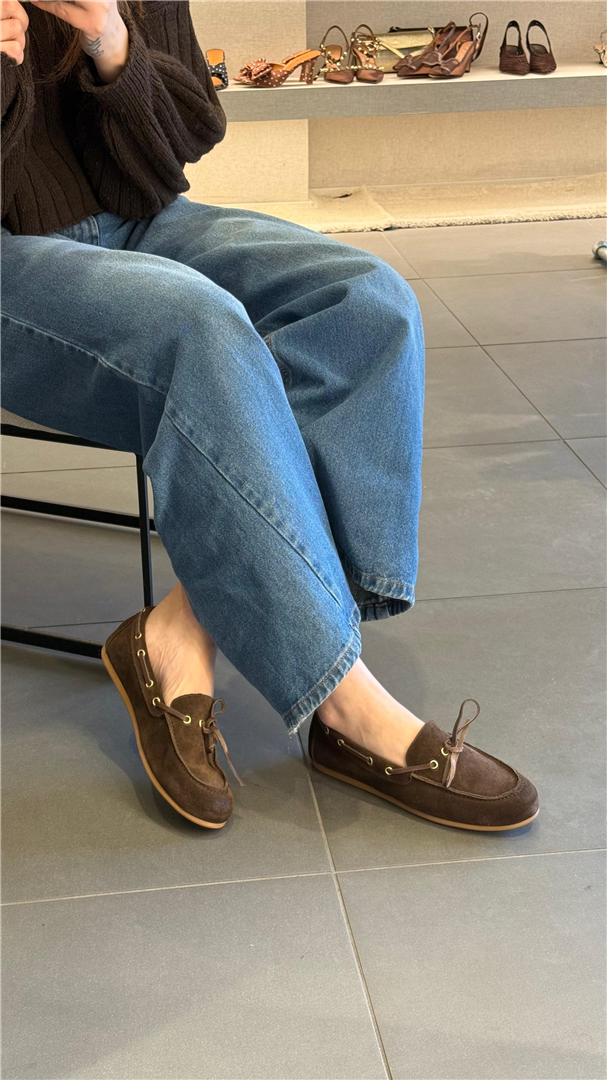 Realizzato in morbido camoscio marrone, presenta dettagli iconici del modello barca: lacci in pelle passanti e cuciture a vista che valorizzano la linea pulita ed essenziale.pelle scamosciata