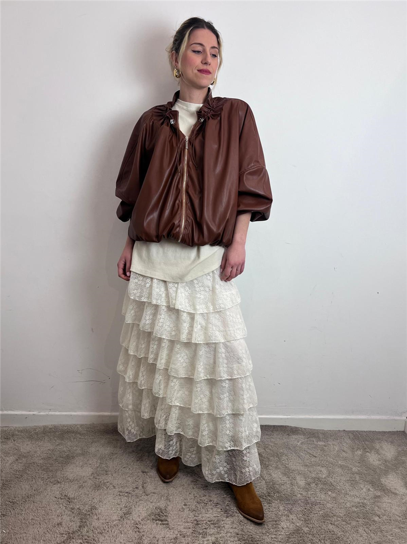Bomber con elastico sul fondo, colore cuoio caldo e sofisticato. Design sportivo-chic con vestibilità comoda e moderna. L'elastico in vita e sui polsi garantisce una silhouette definita. Perfetto per look casual primaverili e di mezza stagione. Taglia unica versatile.