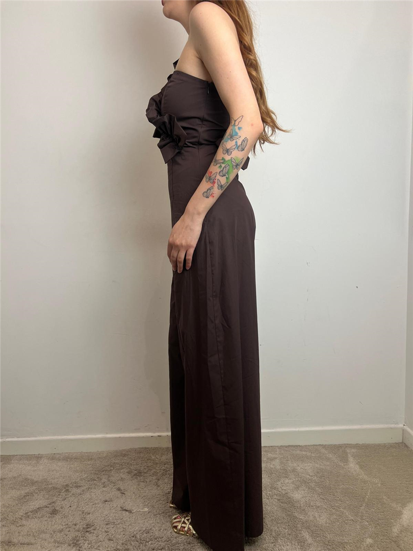 Scivola in un sogno di eleganza metropolitana con questa tuta, che svela un fascino distintivo grazie alla sua scollatura asimmetrica e ai volumi scultorei del volant monospalla. Perfetta per serate urbane